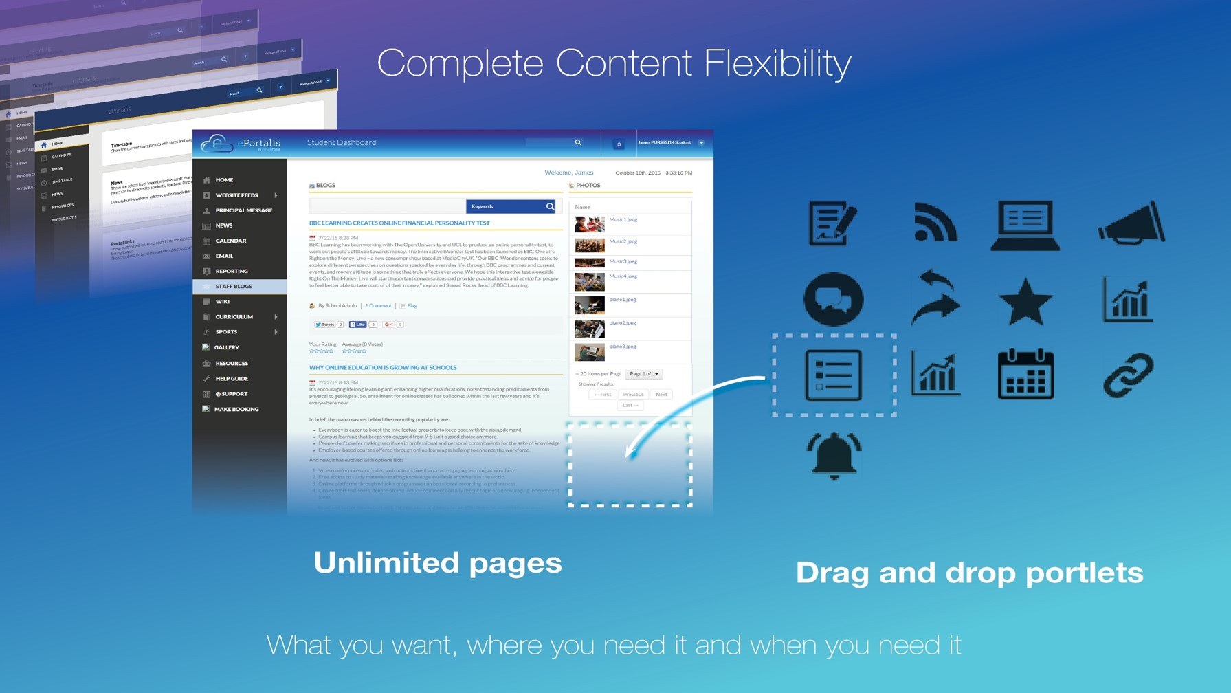 ePortalis is a complete Content Management System providing total control for your school portal. It allows you to add any number of pages and applications along with the flexibility to add custom built applications. Relevant school staff and teachers are assigned permission to provide ownership for specific portal pages allowing them to manage applications and contents including images, documents, files and videos. For example, Head of Junior School is assigned as the owner for junior school pages. The Head of Junior School may require the school registrar to add and update contents on these pages but do not want it to be published until he or she approves it. Similarly, other portal pages that requires ownerships and workflows can be easily applied from your school portal.